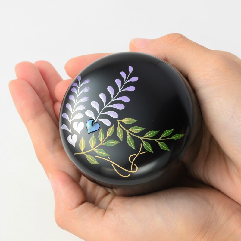 漆の老舗、会津坂本乙造商店・坂本コレクションとのコラボレーションで温かみあるモダン現代蒔絵、本漆塗りのミニ骨壷『こころ』シリーズはひとつひとつて仕上げで製作されております。