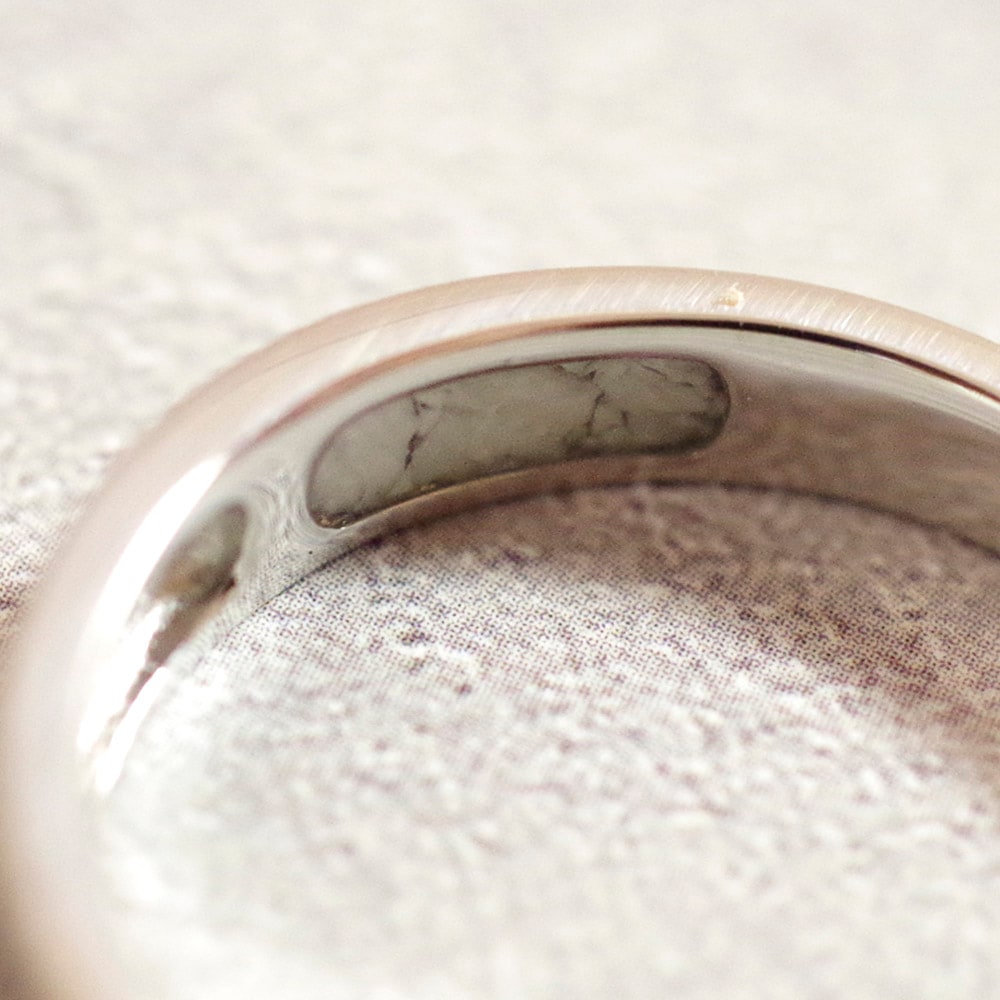 お預かりした形見(ご遺骨や毛)をジュエリーに設けた溝に納め、ご遺骨を包み込むように特殊な樹脂を流し込み、硬化させて封入します。ご遺骨は適度な大きさに砕かせて頂き、スぺースに隙間なく、美しく封入させて頂きます。