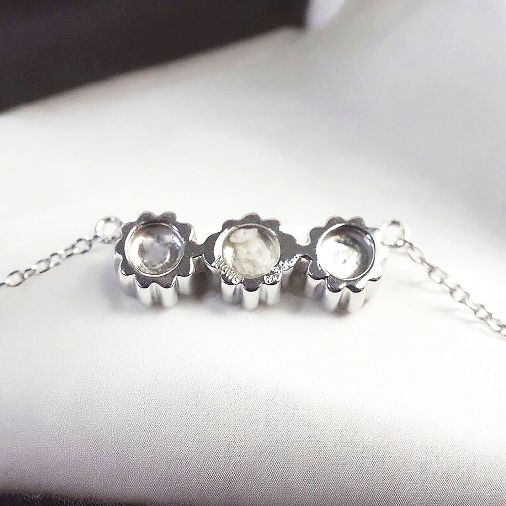 宝石裏側の溝にお預かりしたご遺骨を透明な特殊樹脂で液体から硬化させることにより貴金属と一体化させます。 特にご要望がない場合は3箇所にご遺骨をお納めしますので沢山封入することができます。 スペースを空けておいていつかその時が来たら別のご遺骨をお納めすることも可能です