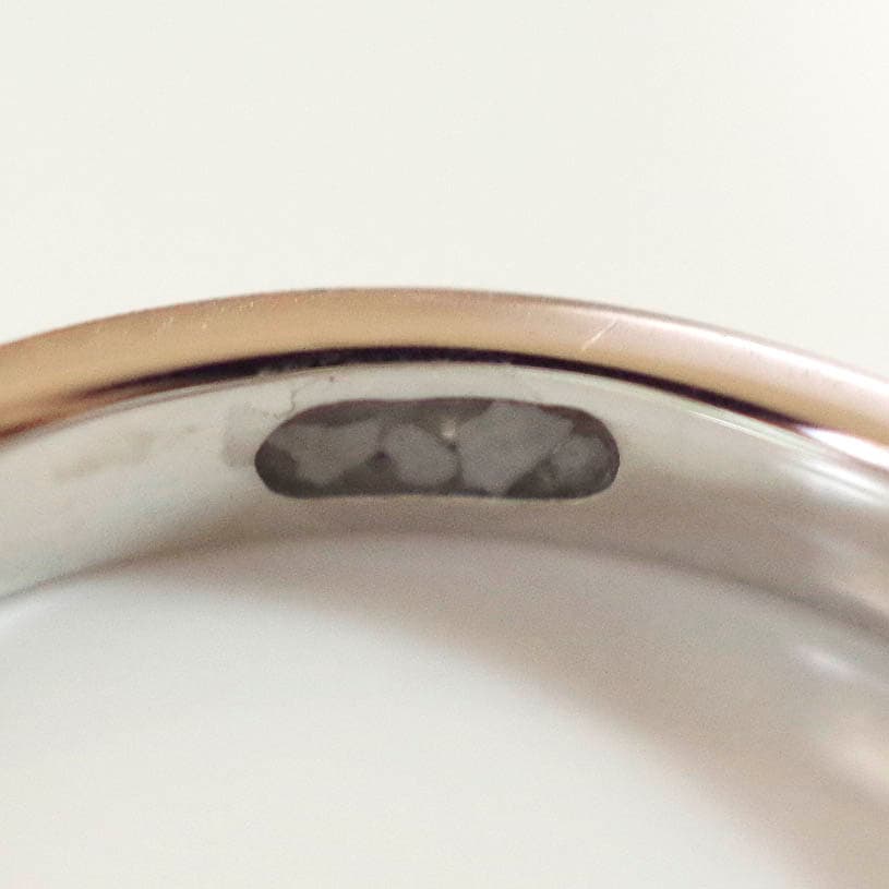 リングの内側の溝にお預かりしたご遺骨(耳かき1〜4さじ程度の量)を透明な特殊樹脂で液体から硬化させることにより貴金属と一体化させます。※立会封入は行っておりません。
