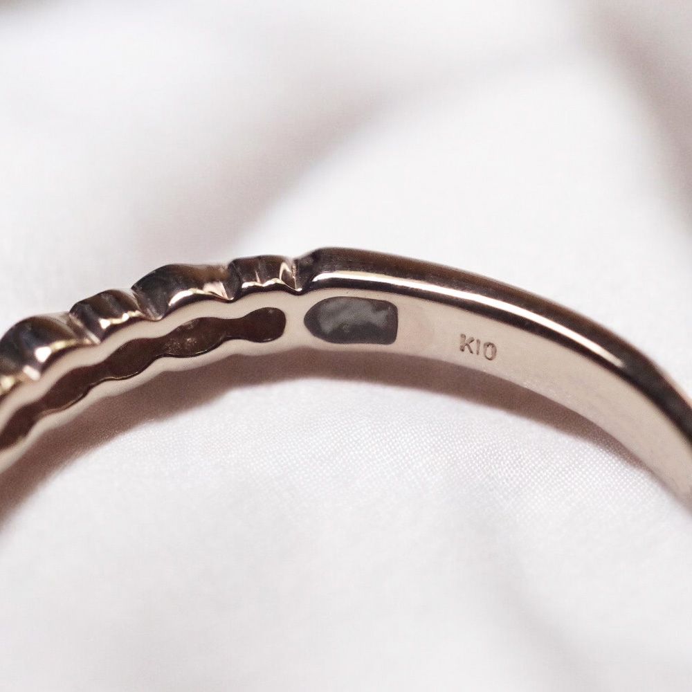 | イエローゴールド / K10YG・K18YG | K10 は42%が金となります。K18は75%が金となります。金以外の素材としては、銀や銅、パラジウム、亜鉛などがあります。比べないとわからないほどではありますは、K18に比べるとK10は色味が少し落ち着いています。金の割合が少ないのでK10は価格的にお求めやすい素材です。 * 銅が含まれているため酸化することがございます。温泉は避けるのがおすすめです。 * 研磨剤の入った磨き布で磨けるのでお手入れが楽です。 |