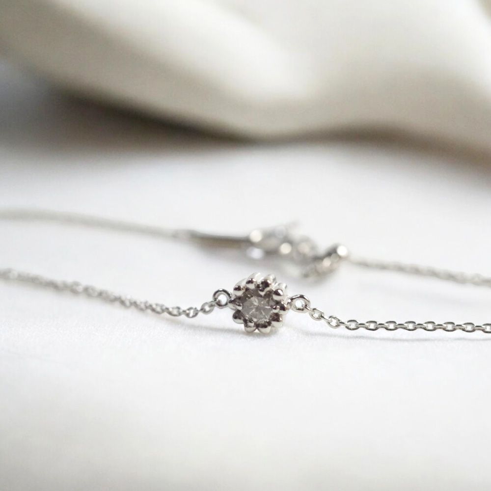 品のあるチェーンでデザインしました。丸あずきは角あずきと違ってキラキラ輝く雰囲気はなく、日常にさりげなく身に着けて頂けます。落ち着いた女性の印象です。