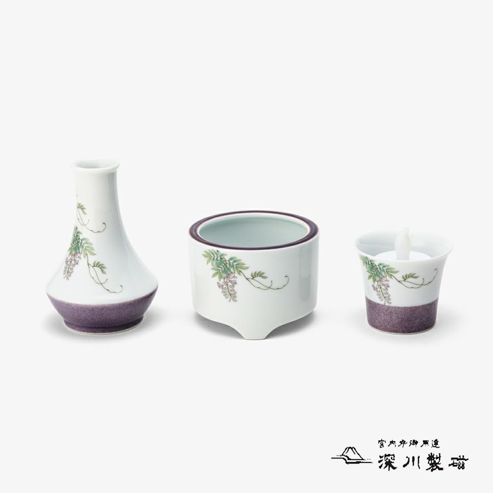 紫藤の花生・線香立・ロウソク立の三具足です。(電池タイプのろうそく、ろうそく立てが付属します)