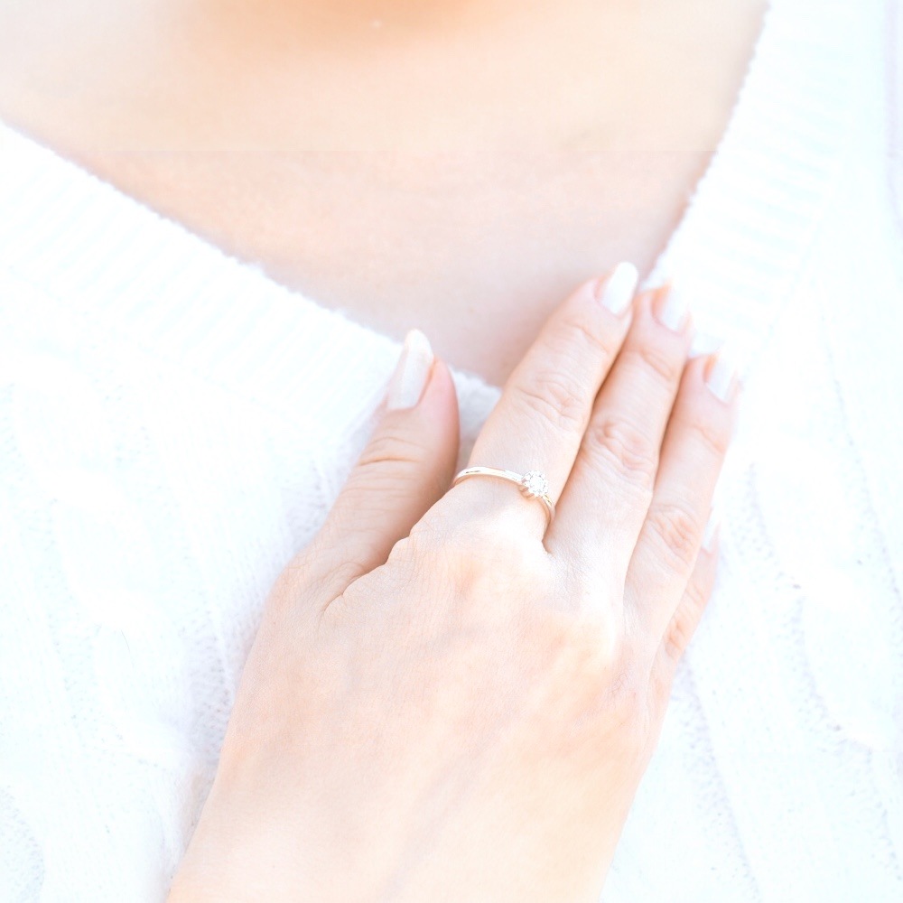 | デザイン | ミル打ちされた枠が宝石を大きくみせる一粒石リング。